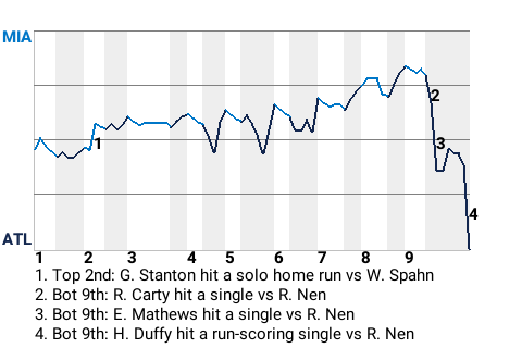 In the bottom of the ninth, with two out and the game tied, 1-1, 27-year old center fielder Hugh Duffy won it for Atlanta. With runners on 1st and 2nd, Duffy hit a 1-1 fastball from Robb Nen for a run-scoring single, giving his team the 2-1 win.