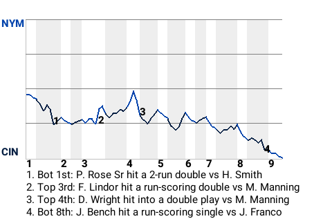 Manning, who dominated for Cincinnati, earned the victory to move to 9-4. He was in control the whole game, scattering 2 hits over 8 innings, while striking out 6. New York batters could never bunch up enough hits to produce a rally.