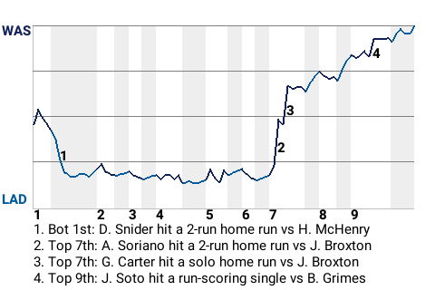 Alfonso Soriano came through for Washington with a 2-run home run in the top of the seventh. The second baseman went 2 for 4 for the game, including 1 home run and 1 double. He scored 2 runs and collected 2 RBI.