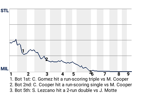Early in the game, center fielder Carlos Gomez had a run-scoring triple for Milwaukee. It was his 1st triple of the season and put the Brewers on top, 1-0.