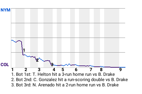 Todd Helton cracked a home run off Bill Drake in the bottom of the first. His 3-run blast put the Rockies on top, 3-0. In all, Helton had 1 single in addition to the home run, while going 2 for 4.