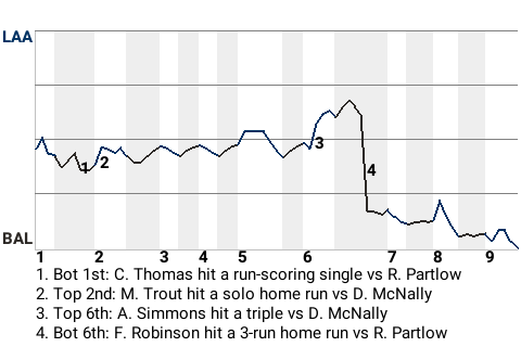 The Orioles got a big hit from right fielder Frank Robinson. In the bottom of the sixth, Robinson smacked a 3-run home run off Los Angeles pitcher Roy Partlow. It was his 3rd home run of the season. Suddenly, the Orioles were ahead, 4-2.