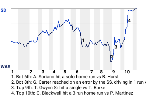 The San Diego Padres topped the Washington Nationals, 6-3, in 10 innings at Nationals Park. The game was highlighted by the performance of San Diego pitcher Bruce Hurst. Scott Linebrink snagged the win in relief. The right-hander allowed no runs on no hits over 1.1 innings. He's now 1-1 on the season.