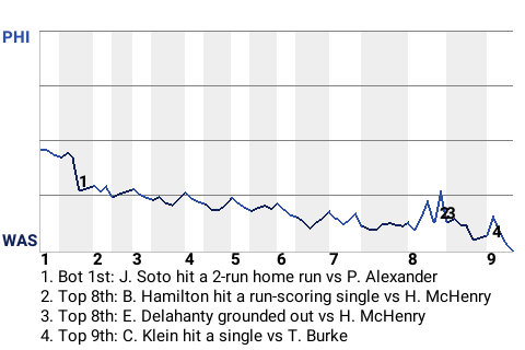 Juan Soto, who leads the NL in bases on balls with 34, took Philadelphia hurler Pete Alexander deep in the bottom of the first. His 2-run home run put the Nationals on top, 2-0. In all, Soto had 1 single in addition to the home run, while going 2 for 4.