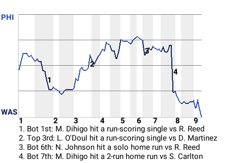 The Washington Nationals topped the Philadelphia Phillies, 6-5, in National League action at Nationals Park. The game was highlighted by the performance of Washington center fielder Martin Dihigo. With the win, Washington pushed its record to 41-34.