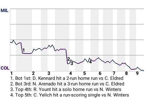 Nolan Arenado had a big 3-run home run for the Rockies in the bottom of the third inning. With Colorado leading 2-1 and runners on 1st and 2nd, he got a fastball from 24-year old right-handed pitcher Cal Eldred and swatted a home run to left. It was his 13th home run of the season, and more importantly, it put the Rockies ahead, 5-1.