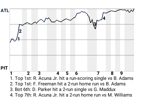 The Atlanta Braves downed the Pittsburgh Pirates, 7-3. The hitting star was designated hitter Ronald Acuna Jr.. Acuna Jr. hit 2 home runs. He scored 3 times and drove in 4 for the Braves. Greg Maddux picked up the win with 8 innings of work. He allowed 3 runs on 6 hits, while walking 2 and striking out 2. On the season, he is now 5-6. The winning streak has now reached 4 games for the Braves.