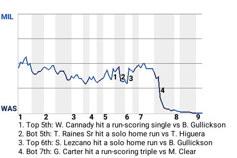 The 8-2 Washington win over Milwaukee was due in large part to Tim Raines Sr. The Nationals right fielder went 3 for 4 with a home run, a double, and a walk, while scoring 2 and driving in 3. Jeff Fassero earned the win after being summoned from the bullpen. The left-hander allowed no runs on no hits in 1.2 innings. He upped his record to 1-0. Washington is 42-36 and Milwaukee, with the loss, 35-43.