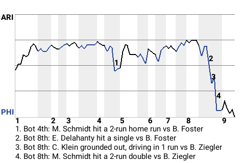Had Schmidt not come through in the bottom of the eighth, who knows how the game would've ended? But with two down, Schmidt hit a 2-run double. The Phillies took the lead, 5-3, and never looked back.