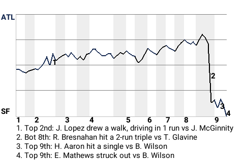 San Francisco took a 2-1 lead on Roger Bresnahan's 2nd triple of the season. The 2-run triple, which Bresnahan hit in the bottom of the eighth, left Atlanta pitcher Tom Glavine shaking his head.