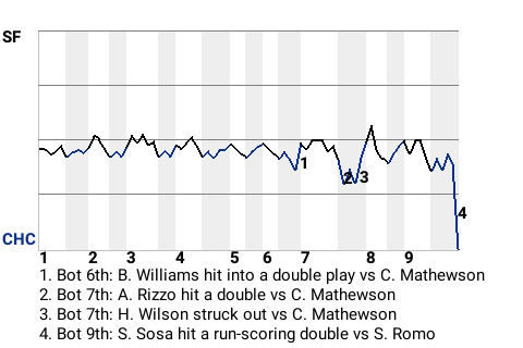 The Chicago Cubs had to overcome a good performance from San Francisco pitcher Christy Mathewson to claim a 1-0 win at Wrigley Field. Mathewson went 8.1 innings and allowed no runs. Chicago reliever Randy Myers picked up the win, while Sergio Romo took the loss for San Francisco. Chicago, now 40-49, holds down 4th place in the National League Central Division.