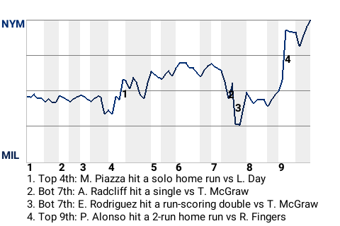 Getting offensive support from Pete Alonso, the New York Mets topped the Milwaukee Brewers, 4-2. Alonso was 2 for 4 with 2 home runs. He drove in 3 runs and scored twice for the Mets. New York reliever John Franco picked up the win to move to 3-4. Rollie Fingers suffered the loss. Tom Seaver sewed up the save, his 17th.