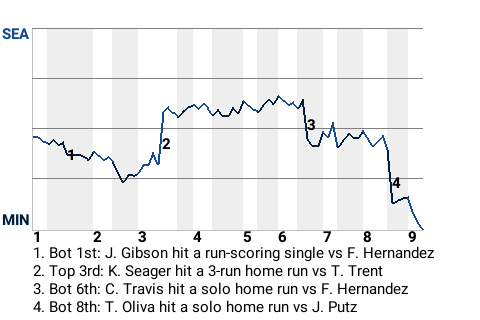 Minnesota beat Seattle at Target Field, eking out a 4-3 win. The triumph was primarily due to third baseman Cecil Travis. He was 3-4 with a home run and a double. He scored 2 runs. The win was credited to Firpo Marberry in relief. His record improves to 2-3. J J Putz took the loss. With the win, Minnesota lifts its record to 11-16.