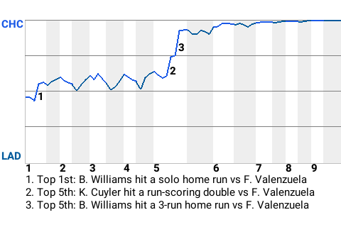 With Chicago leading 2-0 in the top of the fifth, Williams batted against Los Angeles pitcher Fernando Valenzuela. Williams hit a fastball to center for a 3-run home run. His 22nd home run of the season put the Cubs on top, 5-0.