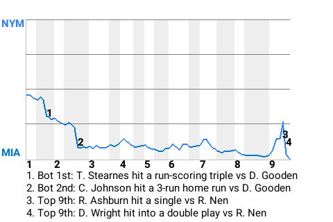 Charles Johnson had a big 3-run home run for the Marlins in the bottom of the second inning. With Miami leading 2-0 and runners on 1st and 2nd, he got a fastball from Dwight Gooden and swatted a home run to left-center. It was his 6th home run of the season, and more importantly, it put the Marlins ahead, 5-0.