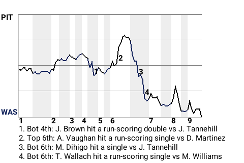 Washington took control in the bottom of the sixth. With one out and runners on 1st and 2nd, Tim Wallach hit a run-scoring single to make it 4-3, Nationals.