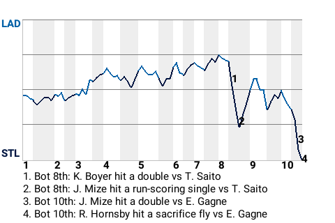 Up to bat in the bottom of the tenth, 29-year old second baseman Rogers Hornsby had a chance to be the hero. Los Angeles pitcher Eric Gagne wanted to foil that plan. But with no outs, Hornsby hit a sacrifice fly. The Cardinals had themselves a thrilling win.