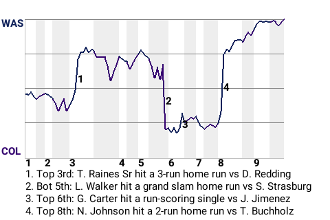 The Washington Nationals defeated the Colorado Rockies by the score of 10-6, with the biggest share of the credit going to right fielder Tim Raines Sr. Raines Sr was 3-5 with a home run and 2 singles, while adding 3 RBI and scoring once for the Nationals on the day. Washington reliever Stephen Strasburg picked up the win, raising his record to 2-1. Taylor Buchholz was tagged with the loss. Tim Burke earned his 27th save, after closing out the game.