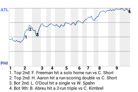 The Atlanta Braves picked up a win at Citizens Bank Park, knocking off the Philadelphia Phillies, 4-2. Starting pitcher Warren Spahn played a key role in the triumph. In 7.1 innings, Spahn surrendered 5 hits, while striking out 3 and walking 2. He allowed no runs. Atlanta, now 47-50, holds down 4th place in the National League Eastern Division.
