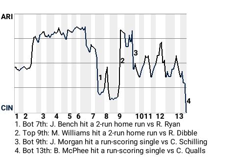 Arizona third baseman Matt D Williams had a terrific game, but it still wasn't enough to get his team a win. Williams was 4 for 5 with a home run, 3 singles, and a walk, while scoring 2 runs and driving in 2, even as Cincinnati beat the Diamondbacks, 6-5, in 13 innings. Cincinnati reliever Noodles Hahn picked up the win, upping his record to 4-2. Chad Qualls absorbed the loss. Cincinnati now sports a record of 50-47.