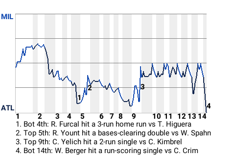 The Atlanta Braves stopped the Milwaukee Brewers, 8-7, in 14 innings at Turner Field. The Braves got a big game from Hank Aaron, who was 3 for 5 with a double and 2 singles. He drove in 2 runs and scored once. The Braves raised their record to 49-53.