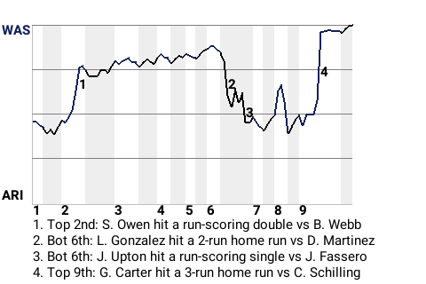Carter had a game-changing home run in the top of the ninth. On a first pitch slider from Curt Schilling, he banged a 3-run home run to left, giving the Nationals a 6-3 lead. It was the 9th home run of the year for Carter.