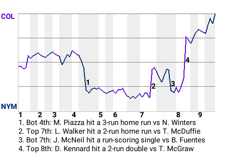 The Rockies grabbed a win, 5-4, at Citi Field, overcoming a fine effort from New York pitcher Terris McDuffie. McDuffie went 6.2 innings and allowed 3 runs. Colorado reliever Brian Fuentes picked up the win, upping his record to 7-3. Tug McGraw absorbed the loss. Huston Street got the save, his 20th in 24 chances.