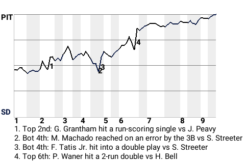 Getting an impressive start from Sam Streeter, Pittsburgh beat San Diego by the score of 3-0. Streeter, now 9-6, was the winner. In 7.1 innings, he gave up 3 hits, while striking out 4, walking 2, and allowing no runs.