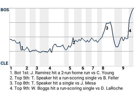Boston ruined an otherwise fine effort from Bob Feller by toppling Cleveland, 3-2. The Cleveland pitcher threw 6.2 innings of 4-hit ball. Boston reliever Daniel Bard was the winner. His record is now 3-0. Dave LaRoche took the loss. Cleveland falls to 9-15.