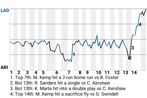 Matt Kemp chipped in a run-scoring sacrifice fly for Los Angeles in the top of the 14th. For the game, the left fielder had 2 hits in 5 at-bats with 1 home run, 1 single, 1 run scored, and 3 runs batted in.
