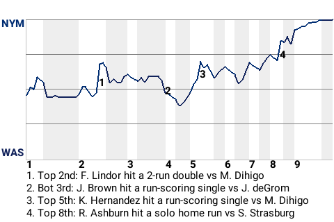 Francisco Lindor had a big hand in the 9-3 New York triumph over Washington. He rattled off 3 hits in 4 at-bats, scoring 2 times and knocking in 2 runs. Jacob deGrom picked up the win with 6.2 innings of work. He allowed 3 runs on 7 hits, while walking 2 and striking out 6. On the season, he is now 13-7. John Franco was credited with the save for New York, his 3rd of the season.