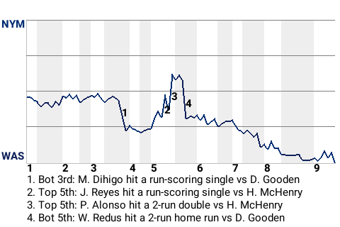 The Washington Nationals topped the New York Mets, 6-5, in National League action at Nationals Park. The game was highlighted by the performance of Washington left fielder Wilson Redus. Getting the save was John Wetteland, his 6th. Washington is now 61-49.