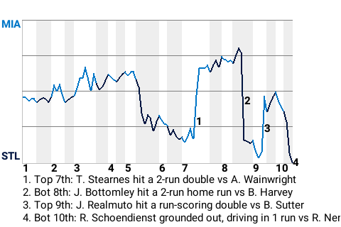 Up to bat in the bottom of the tenth, 30-year old second baseman Red Schoendienst had a chance to be the hero. Miami pitcher Robb Nen had other ideas. But with no outs, Schoendienst grounded out, driving in 1 run. The Cardinals had themselves a dramatic win.