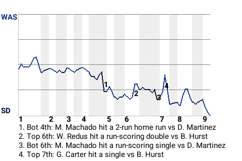 Manny Machado, who is tied for 10th in the NL in bases on balls with 37, took Washington hurler Dennis Martinez deep in the bottom of the fourth. His 2-run home run put the Padres on top, 2-0. In all, Machado had 1 single in addition to the home run, while going 2 for 3.