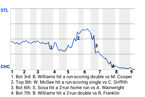 In the bottom of the sixth, Chicago right fielder Sammy Sosa put his team on top. With one out and a runner on 2nd, he hit his 16th home run of the year. St. Louis pitcher Adam Wainwright served it up. Just like that, the Cubs were ahead, 3-2.