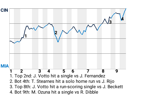 Joey Votto had a critical at-bat with two out in the top of the eighth for Cincinnati. He came through with a run-scoring single to put Cincinnati in front, 3-1.