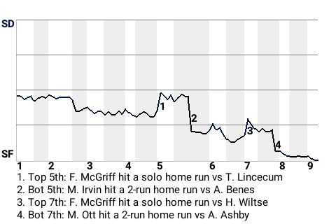 The Giants got a big at-bat from designated hitter Monte Irvin. For the game, Irvin was 1-4 with a home run. He drove in 2 runs and scored once. In the bottom of the fifth, with a runner on 1st, he stroked a 2-run home run. His 29th home run of the season gave San Francisco a 3-1 lead.