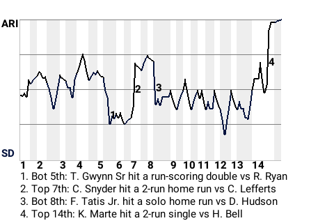 The Diamondbacks beat the Padres in part due to timely hitting. Case in point: the two-out single Ketel Marte produced in the top of the 14th. Batting against Heath Bell, Marte gave his team the lead, 5-3, when he hit a 2-run single.
