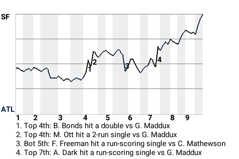 In the top of the seventh, with the game tied, the Braves allowed the Giants to take a 3-2 lead on a base hit and Atlanta error.