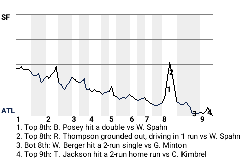 The Atlanta Braves beat the San Francisco Giants, 4-3, at Turner Field. Atlanta first baseman Freddie Freeman had the hot bat. He was 2 for 3 with a home run, a double, and a walk, while scoring 2 and driving in 2. Atlanta starter Warren Spahn was credited with the win after throwing 96 pitches over 7.1 innings. His record now stands at 8-10. Picking up the save was Craig Kimbrel, his 27th.