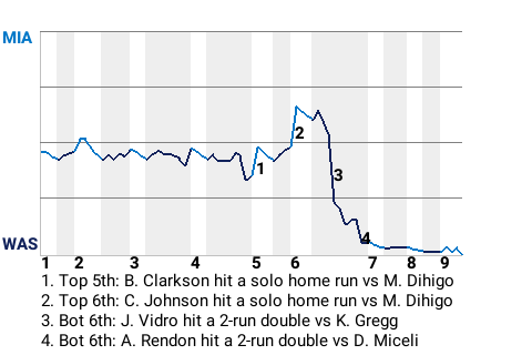 Starting pitcher Martin Dihigo was a major factor in the 6-2 Washington Nationals triumph over the Miami Marlins. The winner was Mel Rojas in relief. His record improves to 1-0. Kevin Gregg took the loss. Earning the save was Tim Burke. He's now cashed in 35 of 39 save opportunities.