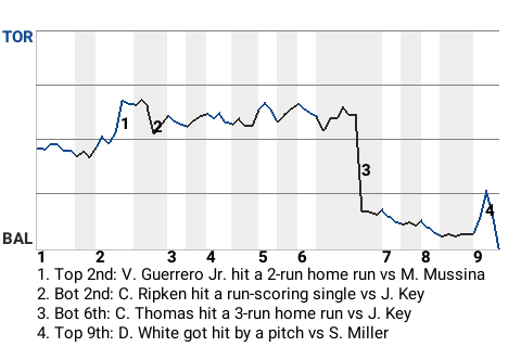 Clint Thomas, who was drafted in the 3rd round of the 2014 draft, took Toronto hurler Jimmy Key deep in the bottom of the sixth. His 3-run home run put the Orioles on top, 4-2. In all, Thomas had 1 single in addition to the home run, while going 2 for 4.