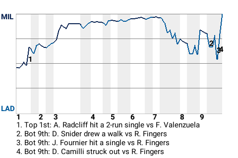 The Milwaukee Brewers stopped the Los Angeles Dodgers, 5-4, at Dodger Stadium. The Brewers got a big game from Christian Yelich, who was 3 for 4 with a double and 2 singles. He scored 2 times. Mike Caldwell, the winning pitcher, improved to 11-11. He pitched 6.2 innings, giving up 9 hits and 4 runs, while striking out 4 and walking 0. Rollie Fingers closed it out for Milwaukee, earning his 32nd save.
