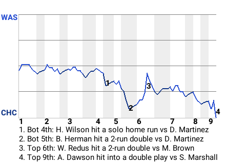 The Chicago Cubs faced a tough opponent in Washington pitcher Dennis Martinez, but did just enough to pull out the victory at Wrigley Field by a final score of 3-2. Martinez went 7 innings and allowed 3 runs. Sean Marshall was credited with the save, his 28th in 32 tries. The winning streak has now reached 4 games for Chicago.