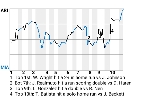 Batista had a game-changing home run in the top of the tenth. On a first pitch fastball from Josh Beckett, he banged a solo home run to right-center, giving the Diamondbacks a 5-4 lead. It was the 10th home run of the year for Batista.
