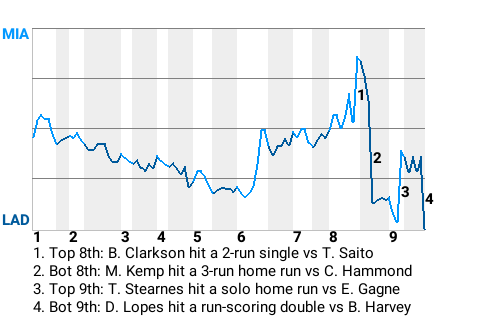 The Los Angeles Dodgers defeated the Miami Marlins, 6-5. Doing his part was pinch hitter Matt Kemp, who was 1-1 with a home run, while adding 3 RBI and scoring once. The second-place Dodgers sport a record of 76-57.