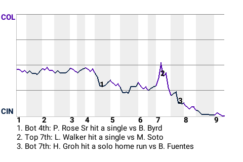 Cincinnati went up, 2-0, on Heinie Groh's 1st home run of the season. The solo home run, which Groh hit in the bottom of the seventh, left Colorado pitcher Brian Fuentes shaking his head.