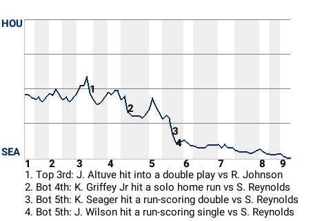 Kyle Seager had a big run-scoring double for the Mariners in the bottom of the fifth inning. With Seattle leading 1-0 and a runner on 1st, he got a fastball from Shane Reynolds, who is tied for 3rd in the AL in wins with 3, and swatted a double to right-center. It was his 6th double of the season, and more importantly, it put the Mariners ahead, 2-0.