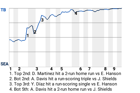 The Tampa Bay Rays trumped the Seattle Mariners, 8-3, at Safeco Field. Tampa Bay right fielder Dave Martinez was terrific. He was 2-4 with a home run, while adding 4 RBI and scoring once. Tampa Bay starter James Shields was credited with the win after throwing 85 pitches over 6 innings. His record now stands at 2-3. The Mariners drop to 11-17 and continue their inconsistent start to the 2014 season.