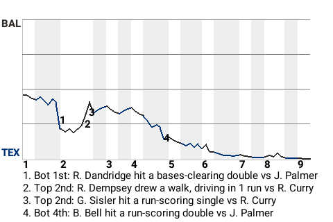 Texas designated hitter Ray Dandridge helped his team beat the Baltimore Orioles, 7-2. Dandridge, who was drafted in the 2nd round of the 2014 draft, went 2 for 4 for the Rangers. Rube Curry, who went 5 innings, was the winning pitcher. He was charged with 2 runs on 3 hits, while walking 3 and striking out 5. His record now stands at 4-2. Matt Harrison locked down his 2nd save.